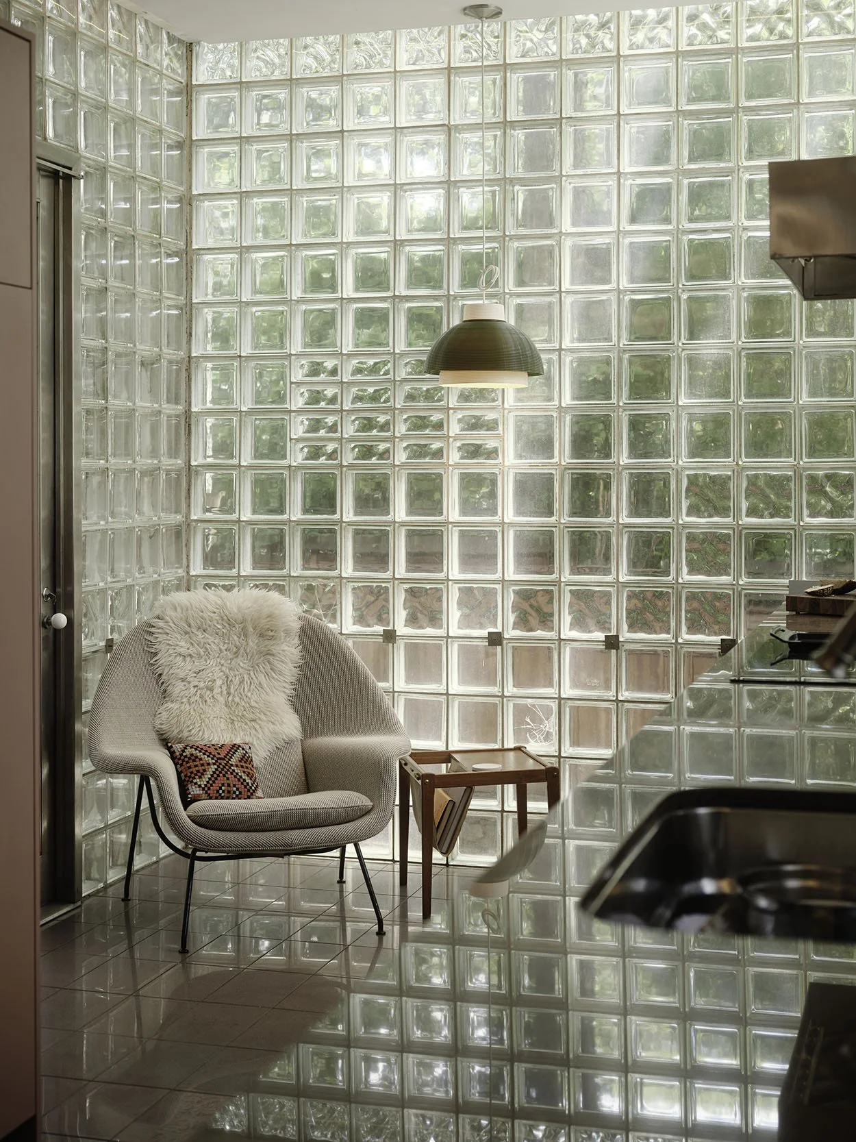 While the home’s silhouette remained, patterned glass from the 1980s was removed, original siding restored, and a new roof and paint gave the exterior a crisp finish.